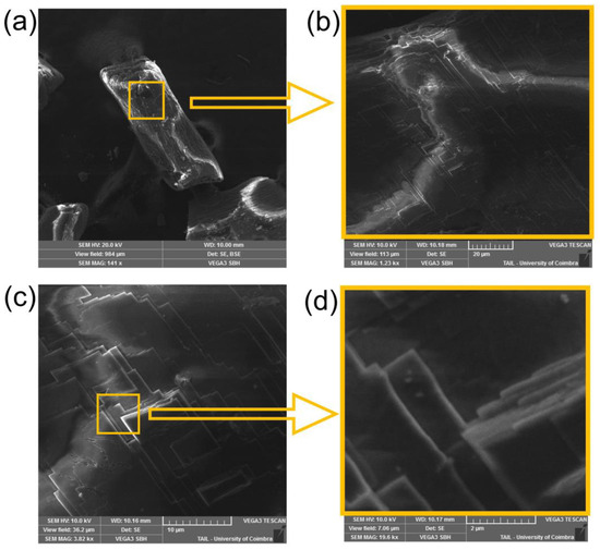 Scanning electron microscopy images of the molecular erbium(III) complex Er(acac)3(cphen) single crystal: (a) a single crystal view at ×100, (b) a general image of the surface of the single crystal at ×1000, (c) a terrace–ledge morphology structure of the surface visible at ×5000, (d) a number of the steps of the terrace–ledge morphology structure distinguishable at ×20,000.