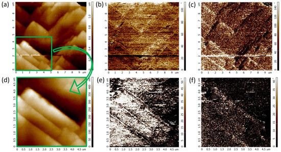Consistent with the SEM results, the SPM scans disclose similar terrace–ledge morphology structures, represented in Figure 4. PFM scan images reveal correlated out-of-plane (OOP) (the corresponding phase component in Figure 4b,e) and in-plane (IP) (the corresponding phase component in Figure 4c,f) piezoresponses that were found to be in agreement with the noncentrosymmetric crystallographic structure of the erbium(III) complex. All the measured OOP and IP PFM components were affected by the terrace–ledge topography similar to those reported in some organic piezo- and ferroelectrics [35,36,37,38]. Figure 4d–f displays the distinct OOP PFM responses within two terrace-ledge structures, and the IP PFM responses reflect the boundary conditions.