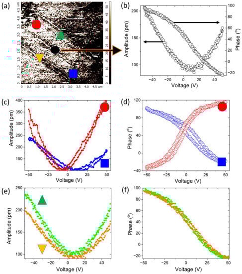 Switching spectroscopy PFM measurements: (a) schematic representation of the measured areas and the corresponding results of the (b,c,e) magnitude and (b,d,f) phase responses. Color legend: the red circle and the blue square correspond to the opposite phases in the OOP PFM response, the black circle points to the area of compressed boundary condition, the green triangle spots the free boundary condition, and the inverted yellow triangle marks the bulk boundary condition.