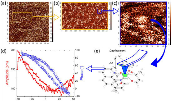 Figure 7 shows the evolution of the scan scaling of Figure 6h to discover a phenomenon of nanoscale clustering in the erbium(III) complex. Figure 7e illustrates the sketch of what is seen in Figure 7c, where the localization of the Er ion is visualized via the dC/dz signal. SS-PFM measurements were acquired precisely in that place according to the probing scheme in Figure 7e, and the results of the magnitude and phase on the voltage dependencies are presented in Figure 7d. The characteristic ferroelectric behavior with strong hysteresis in both the magnitude and phase signals was measured, and the corresponding direct piezoelectric coefficient (d33eff) was attained at 4 pm/V. Considering the maximum local piezoelectric coefficient measured at 8 pm/V, these results constitute the macroscopic polar properties of the erbium(III) complex to be 50% dependent on the Er ion and 50% on the ligand surrounding. The details of the exact spatial coordination between the lanthanide ion and its ligands ultimately define, in addition to the crystallographic symmetry determining the crystal packing in the solid state, the polar properties, hyperpolarizability, and linear and nonlinear optical properties of such lanthanide-based complexes.