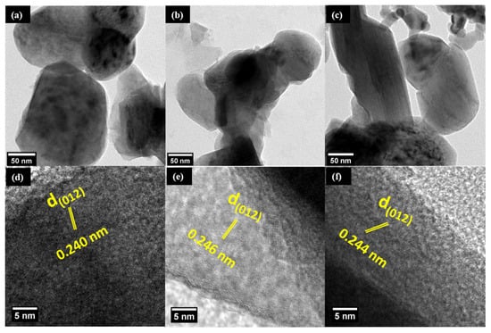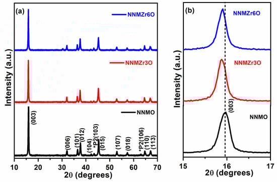 Figure 1a shows the XRD data obtained for the undoped and the Zr–doped NNMO samples that crystalized in the P3-type layered structure with a small concentration of P2-type impurity. All the well-defined sharp and intense peaks could be indexed on the basis of a hexagonal structure (R-3m space group). A shift of (003) peaks to the lower 2θ value is shown in Figure 1b due to Zr doping, which indicates lattice expansion and the successful incorporation of Zr4+ ions with larger ionic radii (0.72 Å) into the Mn4+ site (0.53 Å). To calculate the P2-type cathode phase fraction, Rietveld refinement was carried out on the NNMO sample. The result is displayed in Figure S1 and Table S1. It may be noted that the lattice parameter values of “a” and “c” are consistent with the literature values, whereas the P2-type cathode phase fraction was 14 wt.%. Figure 2a–c represent the low-magnification TEM images of the sample, in which the particles are of random shapes without proper facets for all three samples. From the HRTEM (Figure 2d–f) images, we can see lattice fringes with d-spacing values of 0.240, 0.246 and 0.244 nm for NNMO, NNMZr3O and NNMZr6O, respectively, which belong to the (012) lattice of the P3-type layered material with an R-3m space group [26,27,49]. The HRTEM-measured lattice spacing shows increase in d-spacing for the Zr-doped samples compared to the undoped NNMO sample is consistent with the XRD results.