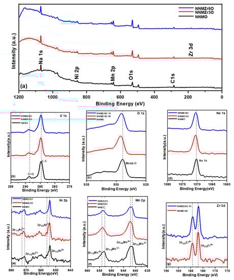 The XPS data of the undoped and doped samples are shown in Figure 3. Figure 3a shows a survey scan that suggests the presence of elements, namely, Na, Ni, Mn, Zr and O, as well as the reference C, and no other impurities. Figure 3b displays the high-resolution XPS spectra of C1s peaking at 284.6 eV (C-C) and a less intense peak at 288.6 eV (C=O) [47]. In Figure 3c, from the high-resolution O 1s data, an intense and broad peak at 529 eV originating from lattice oxygen is clearly seen [39,47,50,51,52]. The O 1s spectra of the doped samples show a minor shift towards higher binding energy. It may be noted that the overlap of lattice oxygen and surface hydroxyl groups can shift the peak towards higher binding energy. As the transition metal high-resolution spectra do not show any significant shifts, this overlap is possibly the reason for the O 1s peak shifts. Figure 3d shows the Na 1s spectra of the undoped and doped samples, with a binding energy value of nearly 1070 eV representing Na+ [39]. From the XPS data for Ni 2p (Figure 3e), we can see the Ni (II) cations have peak positions at around 854 and 871 eV, while the Ni (III) cations have peak positions at 855.9 and 872.5 eV, respectively [39,44,50,51,52,53,54]. The binding energy values at 641 and 653 in Figure 3f show the presence of 2p3/2 and 2p1/2 in the Mn (III) cations, and for the Mn (IV) cations, the 2p3/2 and 2p1/2 binding energy values are 642.1 and 653.9 eV, respectively [39,50,51,52,53,54]. The characteristic peaks in Figure 3g at 181.9 eV and 184.2 eV belongs to Zr 3d5/2 and Zr 3d3/2, respectively; both are a clear indication of a Zr4+ oxidation state [44,53,54].