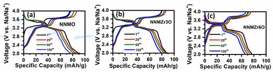 To investigate the redox processes in the undoped and doped samples, cyclic voltammetry (CV) measurements of all three samples were taken. Figure S3 shows the CV profiles of the samples at a scan rate of 0.1 mV/s for three cycles between 2 and 4 V. From the figure, it is clear that there are four major peaks within the cycled voltage limits, which confirms the ordering of Na+/vacancy [30,41,55]. The peaks obtained between the voltage regions of 3and 4 V correspond to the Ni2+-Ni4+ reversible redox couple, whereas the ones below 3V are contributed by Mn3+/Mn4+ [30,34,55]. The CV profiles of the undoped and doped samples imply that through doping, structural stability is attained during cycling, which is indicated by the overlapping oxidation peaks of the doped samples at ~3.7 V. Further, it is seen that structural reconstruction happens in the first few cycles for all the samples, as demonstrated by the reduction peak position at ~3.37 V, which becomes less prominent after few cycles. In the charge–discharge study shown in Figure 4, this surface reconstruction is visible as a small plateau at 3.4 V for all samples that vanishes after few cycles. From the area under the CV profiles, NNMZr6O exhibits the lowest value, which implies a low capacity, consistent with the galvanostatic charge–discharge data of NNMZr6O. Figure 4a–c shows the charge–discharge profile of undoped and doped samples cycled at 50 mA/g, within a voltage window of 2–4 V for the 1st, 25th, 50th and 100th cycles. For all the samples, a clear step-like, prolonged plateau region is obtained during charging, which is the due to the oxidation of Ni2+/3+/4+, with an average potential ≥3.2 V [49,54,55]. The plateau indicates the formation of a biphasic system during sodiation/desodiation. A major portion of Mn will be in the redox-inactive 4+ state, and a small portion will be in the active 3+ state. As mentioned above, a small step-like feature is visible around 3.4 V in the first discharge, which fades away as cycling proceeds.