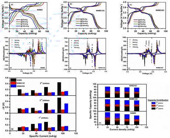 Figure 6a–c displays the first-cycle charge–discharge profiles of the undoped and doped samples at different current densities of 25, 50, 75 and 100 mA/g for a voltage range of 2.0–4.0 V. From the profiles, we can clearly see the low polarization and improvement in capacity at high rates for the NNMZr3O sample compared to NNMO. Figure 6d–f depict the differential capacity analysis of the corresponding data in Figure 6a–c at different current densities. From the analysis, three pairs of redox peaks are noted within 2.5–4 V, demonstrating the three voltage plateaus corresponding to the phase transition that happens during cycling. The redox couple obtained for samples cycled in a voltage window of 2–4 V @25 mA/g is listed in Table S2. Similar peak positions are observed in the CV analysis of all samples, revealing the Ni2+/3+/4+ redox couple for the region between 3 and 4 V. In a more recent study conducted by Zhou, Ya-Nan et al. [36] in suppressing the phase transition of P3–NNMO via local symmetry tuning, the authors mentioned the ordering of Na+/vacancy and a P3–O3 phase transition in the voltage regions of 3.1–3.3 V and 3.5–3.7 V, respectively. For the undoped samples, the position of peaks obtained as we increase the current density shifts towards right/left during charging/discharging, which is an indication of higher voltage polarization. Meanwhile, in the case of doped samples, the positions of the peaks overlap on top of each other, even during the increased current density, which indicates reduced polarization as well as good structural stability [54]. Voltage polarization is an indication of the rate limiting step via a charge pile-up at the electrode–electrolyte interface [56,57,58]. The quantified charge–discharge voltage polarization values as a function of current density are shown in Figure 6g. It is observed that polarization is diminished, possibly due to the elevated interface kinetics. Among the doped samples, NNMZr3O shows less polarization, which is in agreement with the result obtained from the retention rate analysis discussed earlier. Also, we evaluated the capacity contribution from each plateau as we increased the current density for the undoped and doped samples, which is shown in Figure 6h. In the case of the undoped sample, it is observed that as we increase the current density, the capacity contribution by the first plateau decreases, which affects the total capacity delivered by the sample, whereas, for doped samples, this effect is not observed, and hence, they deliver more or less same capacity as at a higher current density. The decreasing first plateau capacity of the undoped sample is an indication of the loss of Ni2+, which could be due to disorder-induced cation mixing. Such mixing is possibly suppressed by Zr doping, as observed, to maintain the plateau capacity for both of the doped NNMO samples.