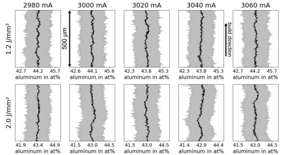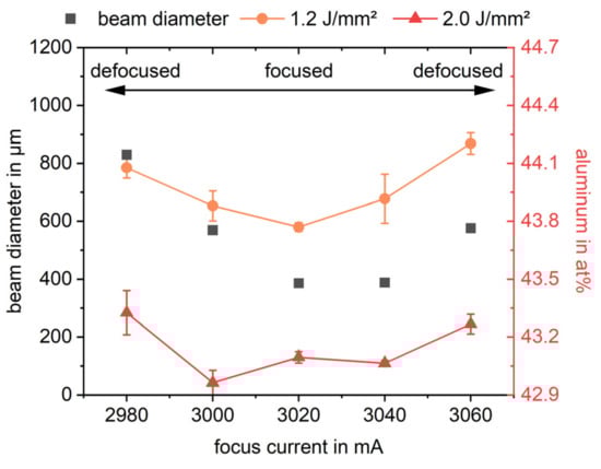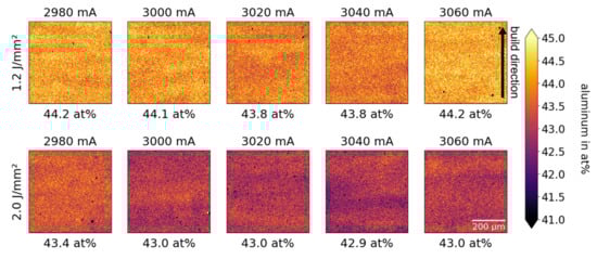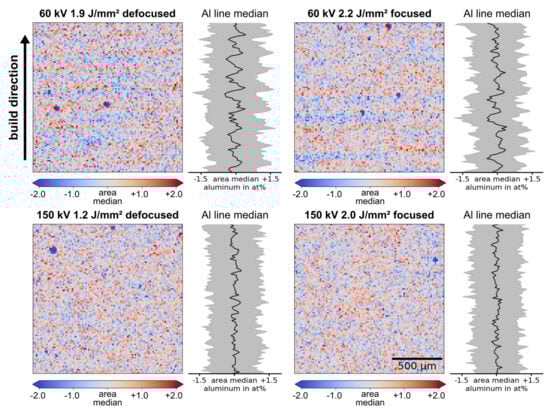 - Reducing the necessary area energy for dense samples decreases the aluminum evaporation for the defocused parameter with low area energy. Consequently, the difference in aluminum content between the two dual microstructure parameters is increased to ≥1 at% compared to 0.7 at%–0.9 at% for 60 kV.
