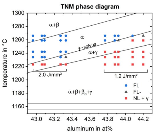 - Moritz, J.; Teschke, M.; Marquardt, A.; Stepien, L.; López, E.; Brueckner, F.; Walther, F.; Leyens, C. Locally Adapted Microstructures in an Additively Manufactured Titanium Aluminide Alloy Through Process Parameter Variation and Heat Treatment. Adv. Eng. Mater. 2023, 25, 2200917. [Google Scholar] [CrossRef]