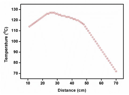 Owing to the fast translation of the ampoule, the cleavage planes and multiplication of nucleation were formed. The 2C5NA compound was decomposed when the experiment was carried out at a low translation rate (below 0.5 mm/h). It may have occurred due to the formation of reactions with the outer atmosphere, melt inhomogeneity, and poor thermal stability beyond their melting point. Depending on the melting temperature of the title compound, the temperature profile of the furnace was optimized (Figure 3).
