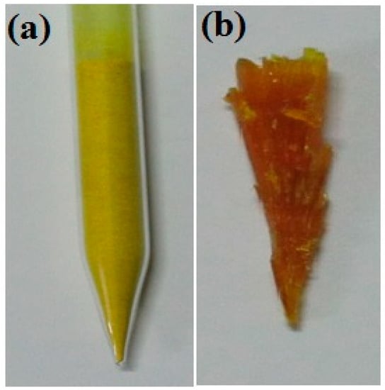 The lowering rate of the ampoule was maintained at approximately 0.7–0.8 mm/h. As discussed in previous chapters, when lowering the ampoule at an optimized lowering rate, the powder melts at its melting temperature, and nucleation is initiated at its crystallization temperature. Due to the large volume of sample loaded into the ampoule (Figure 4a), the bottom portion of the ampoule was completely melted, while the top portion of the ampoule was partially melted. The homogeneity and uniformity of the bulk crystal were affected by the uneven melting of the sample. Hence, several trials were attempted to achieve a homogeneous 2C5NA crystal. The grown crystal of 2C5NA is shown in Figure 4b.