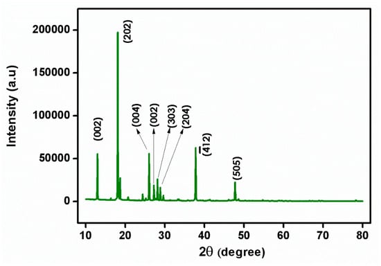 Single-crystal X-ray diffraction is a powerful technique used to determine the atomic structure of crystalline materials. It is particularly useful for studying single crystals, which are solid materials, composed of a regular repeating pattern of atoms. It allows for the determination of the precise atomic arrangement of crystals, providing valuable information about the crystal’s chemical composition, bond lengths, different crystal phases, and polymorphs of a material. It can provide insight into crystal defects, disorder, and other structural imperfections. The centrosymmetric space group of P21/n in the monoclinic crystal structure of the prepared single crystal of 2C5NA was confirmed with single-crystal XRD. The lattice parameter values and volume were obtained as follows: a = 13.66 (18) Å, b = 3.78 (6) Å, c =13.67 (20) Å, β = 91.68 (6)˚, and volume V = 706 (3) Å3. The powder XRD pattern of the 2C5NA with the peak indexations is depicted in Figure 5. High-intensity peaks of the powder XRD pattern were indexed using powder-X software (XBROAD, Crystal Growth Centre, Anna University, Chennai). The unit cell parameter values of single-crystal XRD data are closely matched with the reported values [].