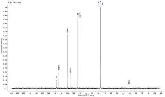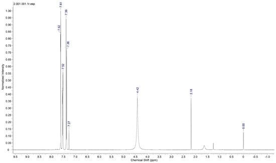 Proton nuclear magnetic resonance (NMR) spectral analysis is a powerful analytical technique used to study the molecular structure and environment of hydrogen atoms (protons) in organic and inorganic compounds. It is a non-destructive method based on the principle of nuclear magnetic resonance, where atomic nuclei with an odd number of protons or neutrons behave like tiny magnets in an external magnetic field. To establish the molecular structure of 2C5NA, the proton NMR spectrum (Figure 6) was recorded with deuterated methanol as the solvent. The chemical shifts in the spectrum revealed the structure of the 2C5NA crystal. The singlet peak observed at 4.42 ppm is attributed to the presence of the NH2 group. Then, other multiplet signals (7.27, 7.39, 7.52, and 7.61 ppm) are ascribed to the CH bonds of different environments [,]. The C-13 NMR spectrum (Figure 7) was taken with deuterated methanol as a solvent to confirm the molecular structure of 2C5NA. The peaks appearing at 147.5, 143.68, 129.92, and 125.26 ppm are due to C-in aromatic rings and C=C (in alkenes). The peaks noticed near 113.28 and 109.72 ppm are indexed to nitriles (Rc=N).The multi-peaks observed around 77.37, 77.04 and 76.73 ppm are endorsed by alkyne C=C-H. The molecular structure of the 2C5NA crystal was validated and it shows a slight change in the chemical environment, which modifies the chemical shift.