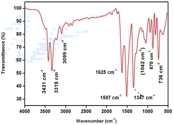 FTIR spectral analysis is a widely used analytical technique for identifying and characterizing the chemical composition of a wide range of materials. It is based on the principle that molecules absorb infrared radiation at specific frequencies, which are related to the vibrational motions of the atoms in the molecule. Infrared spectra have become a potential tool to obtain information about functional groups in organic molecules when they are irradiated with a particular frequency. It can reveal important structural features of complex organic molecules []. FTIR spectroscopy, in particular, is a non-destructive, cost-effective tool for determining the functional group of any organic compound. The FTIR spectrum of 2C5NA is illustrated in Figure 8. The strong peak that appears at 736 cm−1 is assigned to the C-Cl stretching vibration. Aromatic C-H out-plane vibrations are observed in the region of 1000–700 cm−1. The C-N stretching vibration peak exists at 1042 cm−1. The peaks at 1507 and 1347 cm−1 are bending vibrations of the NO2 group. The N–H stretching peak (primary amine) is observed at 1625, 3319, and 3431 cm−1 and the position of the functional group depends on the degree of hydrogen bonds. The peaks at 1625, 3319, and 3431 cm−1 are ascribed to the presence of N-H (primary amine) bending vibrations. The C-H stretching vibrations of the benzene ring are observed at 3099 cm−1 [].