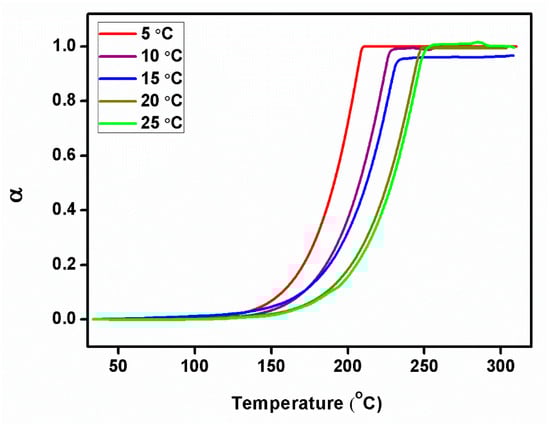 Using the relation (Equation (3)), the degree of conversion (α) was estimated for various heating rates of the TG curves. The calculated α values can be applied to the Coats–Redfern and Friedman methods to estimate the values of Ea, the rate constant (K), frequency factor (K0), and Avrami exponent (n) [,]. An estimated αmax value is presented in Table 1.