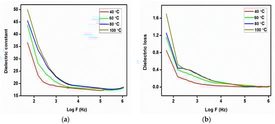 The plot (Figure 12a,b) represents the dielectric constant and dielectric loss as a function of log frequency at different temperatures of the 2C5NA crystal. The dielectric constant decreases when increasing the frequency up to 1 MHz. At low frequencies, a potential barrier is generated by the space charge polarization, which leads to a high value of the dielectric constant. This type of behavior is due to the space charge polarization effect. From the dielectric loss curve, the low value of dielectric loss observed at higher frequencies indicates the quality of the sample []. At low frequencies, the dielectric loss is moderately high, which is due to the high electrical resistivity of grains and their boundaries. Low dielectric loss is essential for the enhancement of nonlinear behavior []. Beyond 1 MHz, both dielectric constant and loss curves attained saturation. This variation can be due to the ionization process in the sample [].