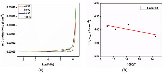 Figure 13a illustrates the frequency-dependent ac conductivity analysis at various temperatures. In the ac conductivity curve, there is no variation observed due to changing the temperature, other than at 40 °C, which reveals that the conduction process is not dependent on temperature in 2C5NA. The ac conductivity of the 2C5NA crystal was analyzed using the conductivity Equation (4). When the angular frequency is ω, the absolute permittivity in free space is ε0, and the phase degree is δ.