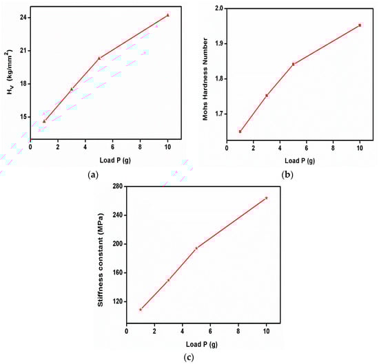 The Vickers microhardness test is a widely used method for measuring the hardness of materials, especially small or thin samples, with a high degree of precision. It is named after its inventor, George Vickers. The Vickers hardness test is based on the principle of indentation hardness, where a known force is applied to an indenter to create an impression on the material’s surface. The size of the indentation is measured, and the hardness value is calculated from the indentation’s dimensions. The Vickers microhardness analysis was performed on the grown sample. To reduce error, and maintain stability and reliability, the Vicker’s hardness test was performed with standard materials and verified with their reports. The surface of the sample was cleaned and polished with wet, high-quality velvet cloths. The dwell time was kept at 10 s for all loading. The indentation was started with the minimum applied load and we observed that the crystal was broken when applying the load of 25 g. Hence, the study was performed with loads less than 25 g. Hence, the test specimen or crystal can break due to many parameters such as weak intrinsic bonds, a higher number of grain boundaries (i.e., polycrystalline nature) on its surface, and poor load-withstanding capabilities. The value of the Vickers hardness number can be estimated by using the relation Hv = 1.8544 P/d2 kg mm−2. The graph shows the variations between the applied load and the Vickers hardness number of the sample. The Mohs hardness number of the specimen was also evaluated using the equation HM = 0.675(HV)1/3. The Vickers hardness number increases with the increasing applied load, which reveals the behavior of the reverse indentation size effect []. The graph represents the variation in the Vickers hardness number (Figure 14a) and Mohs hardness number (Figure 14b) with the function of load. The stiffness constant of the sample was estimated with the Wooster empirical relation and is displayed in Figure 14c.