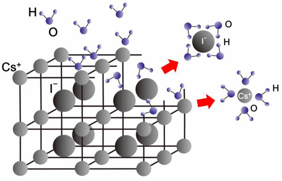 The influence mechanism of humidity exposure on the microstructure morphologies of the CsI(Tl) screens was studied. CsI ionic crystal has strong polarity because of the large electronegativity discrepancy between the cesium and iodine (the electronegativity of Cs and I are 0.79 and 2.66), though that difference is slightly decreased by the doping of thallium ions (the electronegativity of Tl: 1.62) [29]. Under humidity exposure, due to the solvation ability of the polar water molecules, the negatively charged oxygen atom and the positively charged hydrogen atom attract the cesium cation and iodine anion, forming the Cs-O and I-H ion–dipole bonds, as shown in Figure 2. And then the original physical configuration of CsI ionic crystal is destroyed. In addition, there are a large number of dangling bonds on the grain surface of the CsI(Tl) screen, attracting the polar water molecules to absorb and bond, thereby decreasing the surface energy [34]. On the other hand, the grain boundaries of microcolumns are aberrant due to the preferred orientation discrepancy of the atoms near the grain boundaries and the microstructure defects, such as vacancy, dislocation, and bond abnormity [26,35,36]. Therefore, grain boundaries are the other position attracting the polar water molecules.