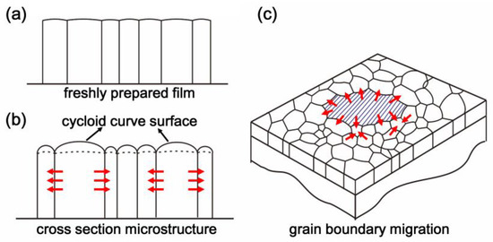 The surface and boundaries trend of the microcolumnar grains of CsI(Tl) screens exposed in humid air is illustrated in Figure 3. Due to the surface tension of the water molecules, the surface of columnar grains subjects an additional surface pressure during the bonding process. Under the combination of the additional surface pressure and the grain boundary drag, the micro-column top surfaces become the cycloid profiles, as shown in Figure 3b and curve height would increase as the exposure time prolongs. Meanwhile, the absorbing and diffusing of the free-polar water molecules along with the grain boundaries could decrease the diffusion activation energy further and break the chemical potential balance among grains. Based on the Young–Laplace equation, the convex side of the grain boundary always has a higher chemical potential than the concave side [37,38]. The chemical potential gradient causes the atoms crossing the grain boundary from the convex side to the concave side, and thus the boundaries would migrate in the direction of the grain center with a small curvature radius that eventually leads to the large-sized grains with the concave boundaries growing larger at the expense of the adjacent small grains during the recrystallization process, which is called the engulfment effect, as shown in Figure 3c. Therefore, there appear to be some oversized grains, as shown in Figure 1b,c.