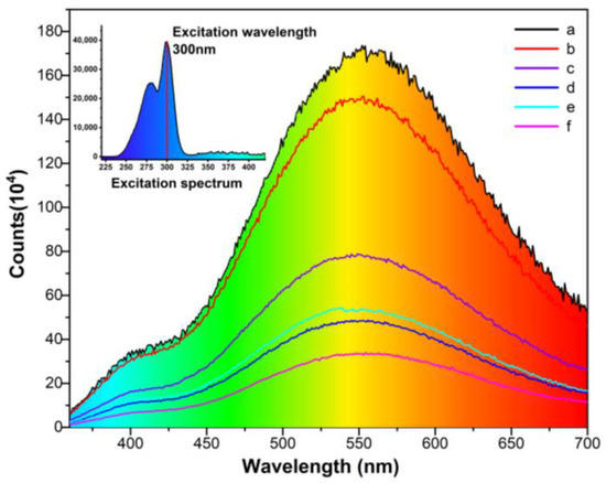 The photoluminescent spectra of CsI(Tl) screens with different exposure times in humid air: (a) freshly prepared, (b) 1% RH in an electronic dry cabinet for 30 × 24 h, (c,d) exposed to 40 ± 5% humid air 10 × 24 h and 30 × 24 h, (e,f) exposed to 80 ± 5% humid air 10 × 24 h and 30 × 24 h.