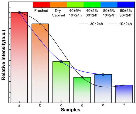 Relative PL intensities of CsI(Tl) screens with different exposure times in humid air: (a) freshly prepared, (b) 1% RH in an electronic dry cabinet for 30 × 24 h, (c,d) exposed to 40 ± 5% humid air 10 × 24 h and 30 × 24 h, (e,f) exposed to 80 ± 5% humid air 10 × 24 h and 30 × 24 h.