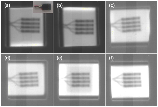 X-ray images of the electronic device through the screens with different exposure times in humid air: (a) freshly prepared, (b) 1% RH in an electronic dry cabinet for 30 × 24 h, (c,d) exposed to 40 ± 5% humid air 10 × 24 h and 30 × 24 h, (e,f) exposed to 80 ± 5% humid air 10 × 24 h and 30 × 24 h.