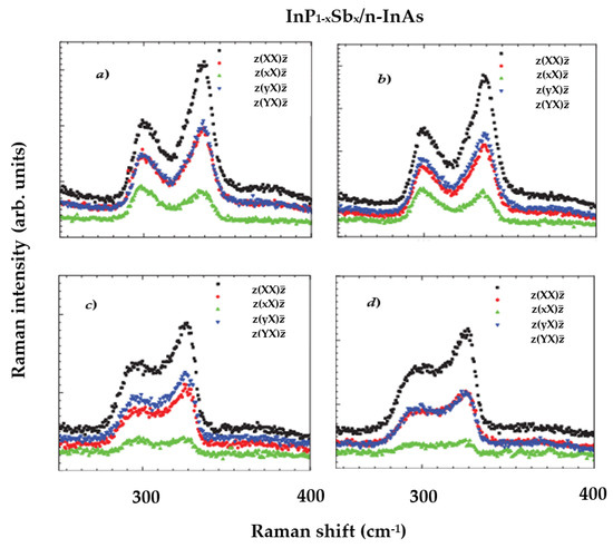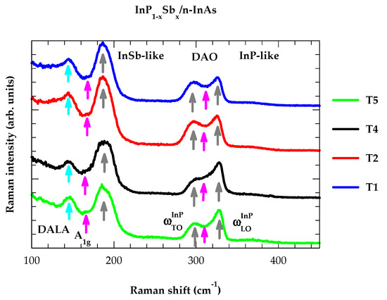 In Figure 2, we have reported our RT Raman scattering spectroscopy results recorded on GS-MBE-grown InP1−xSbx/n-InAs samples (#T1, T2, T4, T5, see Table 1) by using a Reinshaw InVia spectrometer in the backscattering geometry in the 100–450 cm−1 frequency range. The polarization-dependent Raman measurements (Section 4.1.1) of these samples are presented in Figure 3.