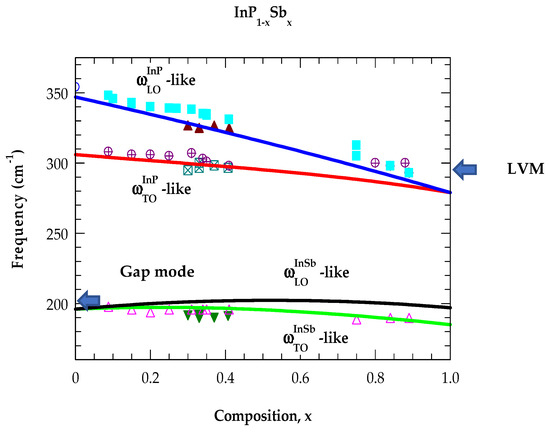 Unlike observing the InP-like optical phonon doublets, we could only identify a single broad InSb-like band (Figure 2) near ~195 cm−1 in GS-MBE-grown samples. Obviously, the InSb-like band in InP1−xSbx is not resolved, as its large (~10 cm−1) full width at half maximum (FWHM) has a value larger than the separation of () ~8 cm−1 in InSb, at x = 1 [49]. We strongly feel that the low-intensity InSb-like band as well as the gap mode of InP:Sb near x → 0 are either buried in the vicinity of disordered optical bands and/or falling in the region where the density of phonon states is high [24,25,26,27]. In Section 4.1.2, we will address this issue theoretically by calculating the gap mode of Sb in InP and LVM of P in InSb using a realistic lattice dynamical model in the ATM-GF framework [59].