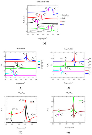 We have constructed the complex dielectric functions for both the binary InP, InAs, InSb, and ternary InP1−xSbx alloys by using a classical “Drude-Lorentz” model. The optical constants are simulated by using Equations (3) and (4) in the frequency range of 400 cm−1 ≥ ≥ 100 cm−1 by incorporating the phonons estimated from the RSS measurements (Section 4.1 and Section 4.1.1). In Figure 5a–e, we have displayed -dependent results of ; for InP, InAs, InSb and InP1−xSbx (using x = 0.33, as an example).