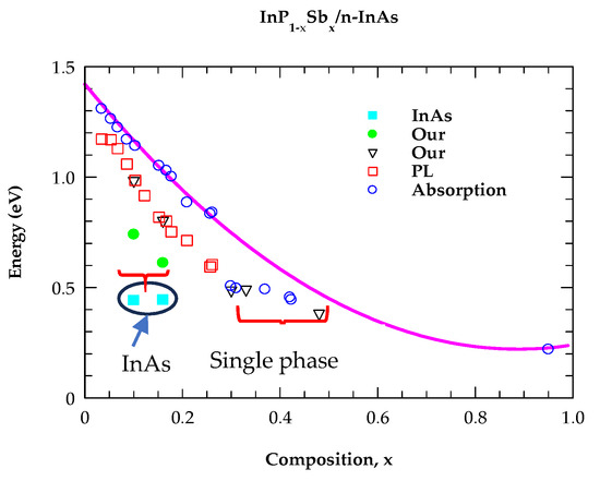 The perusal of Figure 6 has revealed two energy phases (small red bracket) with values displayed by black inverted triangles, green solid spheres, and a nearly constant value of InAs (substrate) shown by sky-blue-colored squares. For x ≥ 0.30, our PL study has provided only one energy phase (large red bracket) indicated by black triangles. Earlier studies by Reihlen et al. [26] on InP1−xSbx epilayers have suggested large miscibility gaps between x = 0.02 and 0.97. Our results indicated that high-quality single-phase epilayers can be obtained around x ~ 0.3 in the center of the miscibility gap. The GS-MBE-grown epitaxial layer with composition x = 0.31 is lattice-matched to the InAs substrate. The strain energy caused by lattice mismatch has locally changed the range of miscibility, making the growth of a single crystal possible. Obviously, the OMVPE results cannot be fully applied to GS-MBE-prepared InP1−xSbx/n-InAs samples, as the growth situation may differ from equilibrium conditions. Moreover, our MDF simulation for InP0.67Sb0.33 alloy provided the lowest energy gap E0 ~ 0.46 eV, in good agreement with the existing first-principles calculation and the PL measurements.