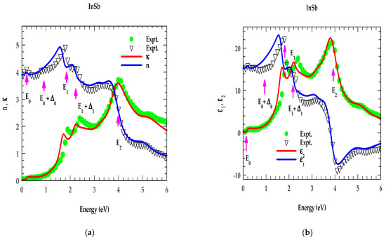 (a) Comparison of simulated MDF results (blue and red lines) for n(E) and κ(E) with experimental data (Refs. [22,23]) for InSb (indicated by symbols) in the energy range of 0–6 eV. Magenta vertical arrows indicate the critical point energies; (b) same key as (a) but for and .