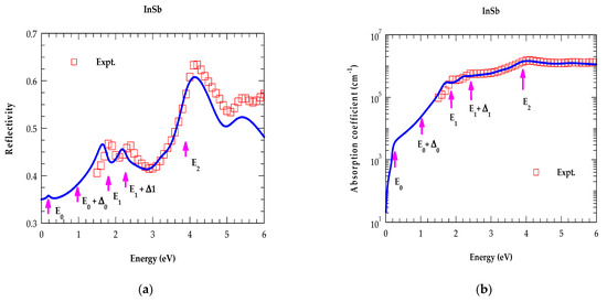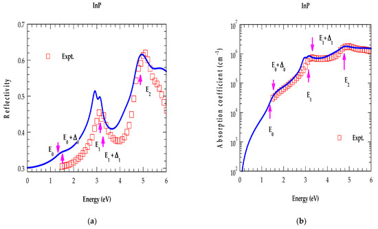 For InSb and InP, our calculated results of reflectance and absorption coefficients displayed in Figure 9a,b and Figure 10a,b have agreed reasonably well with the experimental results [22]. Interestingly, the simulations in each category has provided distinct CP energy features of the band structures arising from the inter-band transitions (indicated by magenta vertical arrows). Like and , the and data have also revealed appropriate shifts in the major CP energy structures. Among other features, the reflectivity spectra indicated the strongest peaks at the gaps, varying between ~0.6 and 0.625 [see Figure 9a and Figure 10a], in very good agreement with the observed values for the binary (InP, InSb) materials [22].