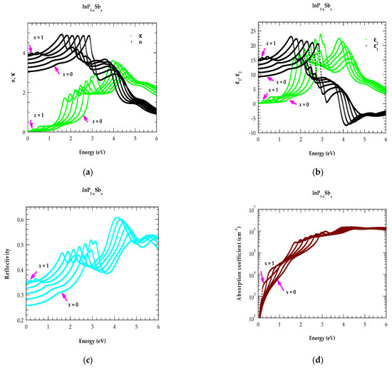 In Figure 11a–d, we have reported our simulated results of , , respectively, for InP1−xSbx ternary alloys in the photon energy range of by selecting the composition increment of x by 0.2. In each figure, the results have revealed an appropriate shift in the CP energies toward the low-energy side as x is increased, in corroboration with the observed changes from InP → InSb band structures. Like ; , (indicated by black and green points in Figure 11a,b the near normal-incidence reflectivity (shown by sky-blue-colored points) and the absorption coefficient (represented by brown points) in Figure 11c,d also revealed distinct composition-dependent shifts in CP structures. Our simulations of optical constants for the InP0.67Sb0.33 alloy have provided the lowest energy bandgap value E0 ~ 0.46 eV, in very good agreement with the existing first-principles calculation as well as our PL measurements (see Figure 6 and Table 3).