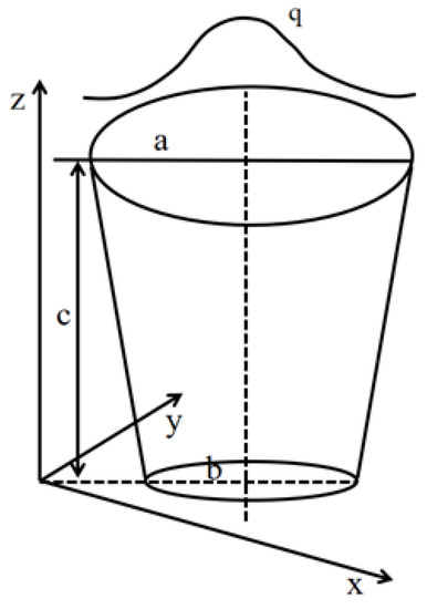 Figure 1 shows a schematic diagram of the conical heat source model. Its shape is conical, with a larger radius on the upper surface and a smaller radius on the lower surface. The cross-sections of the model at various positions on the Z-axis are all circles, and the heat flux density values at different places on the Z-axis are the same. The expression for the conical heat source model is as follows:
