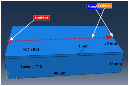 The workpiece model was established using the ABAQUS finite element simulation software (2023 version, developed by Dassault Systèmes, a company headquartered in France), as shown in Figure 2. The experimental material used was a hot-rolled Inconel 718 sheet produced by Shanghai Baoshao Special Steel Co., Ltd. (Shanghai, China) A wire-cutting method was employed to obtain a plate specimen with dimensions of 50 mm × 30 mm × 10 mm (length × width × height). As shown in Figure 2 below, the lower part represents the Inconel 718 base material. In contrast, the upper part consists of a one-millimeter-thick sodium silicate binder and a mixture of NiCrBSi powder for the fused coating. The red circle indicates the starting point of electron beam scanning, and the red dashed line represents the scanning direction.