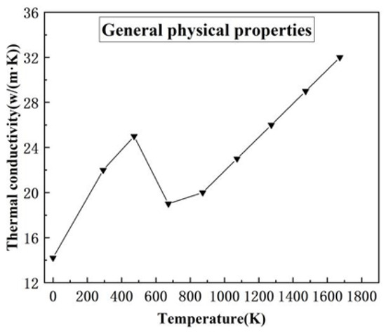 The thermal properties of the Inconel 718 substrate are shown in Table 1. The thermal property curve of Inconel 718, a nickel-based alloy, is calculated based on the elemental mass content using Jmatpro and shown in Figure 3 and Figure 4. The melting point of Inconel 718 is 1260–1320 °C, or 1533–1593 K. In the ABAQUS finite element software, the Kelvin scale is commonly used as the temperature unit.