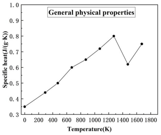 This study simulates the temperature field during electron beam scanning using the finite element software ABAQUS. After constructing a three-dimensional model, it is necessary to set the thermal properties of the model and assign them to different objects. The thermal properties of materials vary with temperature. Common metallic materials can be obtained from the literature [29], while some uncommon materials can be calculated using Jmatpro software. The commonly used thermal properties in temperature field simulation include density, conductivity, specific heat, and latent heat [30,31].