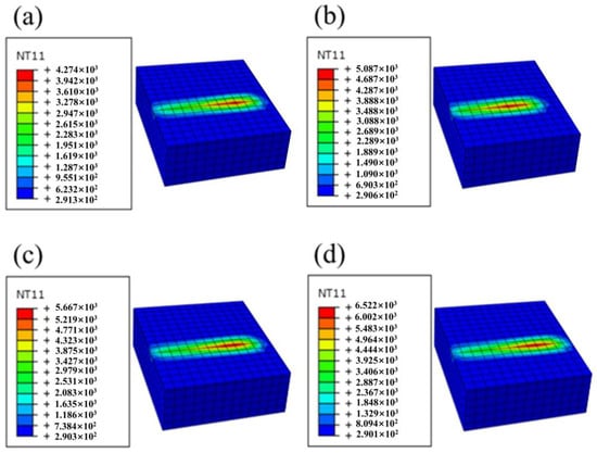 Temperature field clouds of the melt pool at different Iw at t = 6.25 s: (a) Iw = 15 mA; (b) Iw = 18 mA; (c) Iw = 21 mA; (d) Iw = 24 mA.