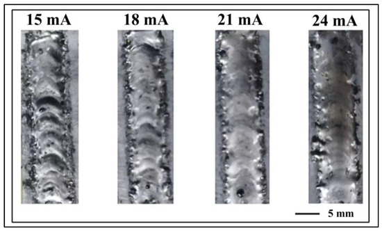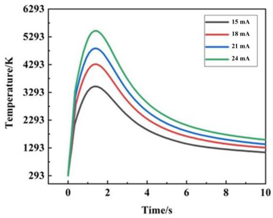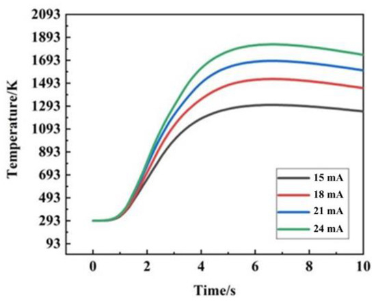 When investigating the impact of various beam currents on the temperature distribution, the parameter scope was refined based on insights from the existing literature. Considering the equipment situation and experience, four different beam currents of 15 mA, 18 mA, 21 mA, and 24 mA were selected to investigate beam variation’s effect on the cladding’s quality. To ensure the accuracy of the experimental results, this simulation used the method of controlling variables to keep the other parameters outside the beam unchanged. The simulation parameters are shown in Table 2.