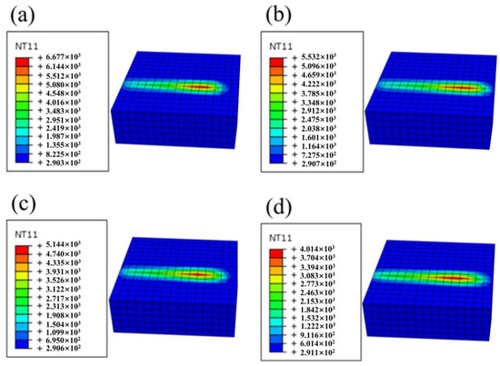 Temperature field clouds of the melt pool at different scanning speeds at t = 6.25 s: (a) 80 mm/min (b) 240 mm/min (c) 300 mm/min (d) 360 mm/min.
