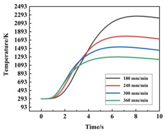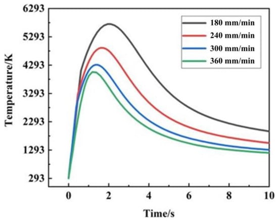 Extracting the nodal coordinates (8, 12, 9) between the matrix and the powder from ABAQUS, the changing curve of the pool temperature at different time points is analyzed, as shown in Figure 10. Figure 11 shows the temperature variation curve of the material surface at coordinate points (8, 12, 10) at different time points. From the figure, it can be observed that when the scanning speed is 180 mm/min, the peak temperature of the pool reaches 5700 K, and the powder is completely melted into the liquid phase. The temperature in the joining zone reaches as high as 2300 K. This value significantly surpasses the matrix’s melting point of 1533 K. This indicates that while the powder is melting, the matrix is also rapidly melting. This is considered overeating, leading to powder dilution and decreased bonding performance. At the same time, extensive melting of the matrix will result in a decrease in its own performance and severe surface deformation. When the scanning speed reaches 240 mm/min, the joining zone temperature reaches 1700 K, which is still above the melting point of the matrix, indicating over-melting. When the scanning speed is 300 mm/min, the joining zone temperature is around 1500 K, and the peak temperature on the surface is 4200 K. At this point, the matrix undergoes partial melting while the powder is fully melted. The liquid phase of the fully melted powder and the surface of the matrix form a closely bonded metallurgical layer, achieving a good overlay process. When the scanning speed is 360 mm/min, the joining zone temperature is only 1300 K. At this time, the overlay layer is shallow, the joining zone is not compact, and there is only a thin layer, indicating under-melting.