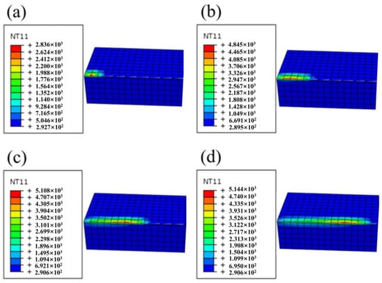 Subsurface temperature field cloud maps at different moments in the molten pool with a beam current of 18 mA and a scanning speed of 300 mm/min: (a) 0.384 s (b) 1.460 s (c) 3.190 s (d) 4.921 s.