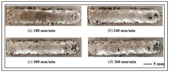 Macroscopic images of electron beam cladding test samples under different scanning speed conditions. (a)180 mm/min (b) 240 mm/min, (c) 300 mm/min (d) 360 mm/min.