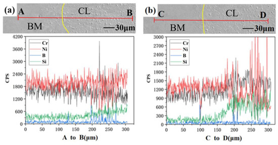 SEM micrographs and line scan EDS images of the cross-section morphology of the electron beam cladding layer at a beam current of 18 mA (a) and a scanning speed of 300 mm/min (b).