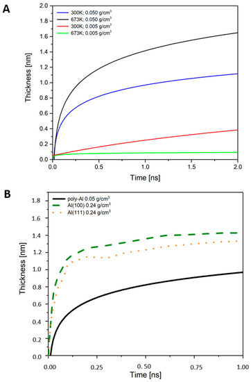 Thickness change for the oxide films grown on poly-Al substrates. (A) Average thickness of oxide films grown on poly-Al substrates at 300 K and 673 K with 0. 005 g/cm3 and 0.05 g/cm3 O2 densities. (B) Thickness comparison of oxide film grown on the poly-Al (this study) and Al single crystals with (100) and (111) surface orientations at 300 K [15].