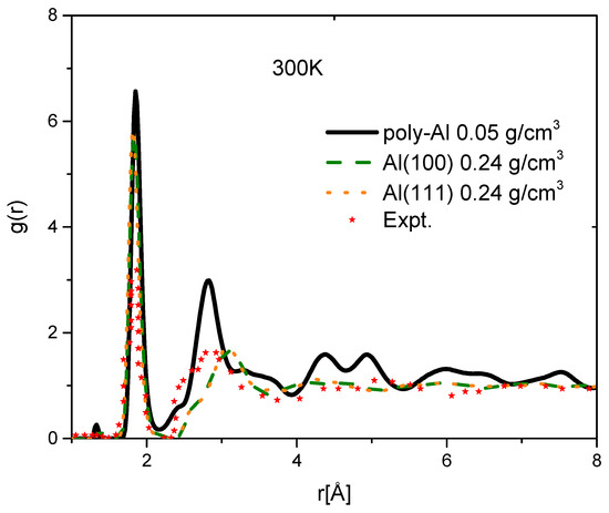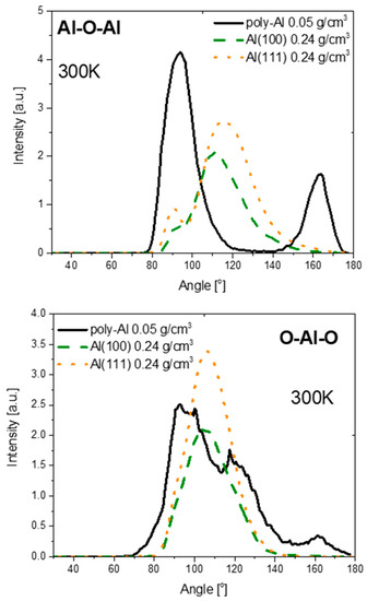 Figure 2 shows the total radial distribution function, g(r), computed for the thicker oxide film grown on the poly-Al substrate at 300 K (black line). For comparison, the g(r) function simulated for oxide films grown on Al(100) and Al(111) single crystals at 300 K and 0.24 g/cm3 (dashed and dotted lines, respectively) is also included [15]. Experimental data for porous anodic oxide film are represented by an asterisk in Figure 2 [38]. The visible peaks represent respective coordination shells, and the most intense peak corresponds to the first neighbor coordination shell, whose position corresponds to the Al–O bond length. The high-intensity first peak is accompanied by lower-intensity peaks located at about 1.5 Å and above 3 Å for oxide films grown on poly-Al. The position of the latter peak corresponds to the O–O bond length. A small mismatch in the intensity of the most pronounced peak was observed between oxide films grown on poly-Al and Al single crystals. This was related to a difference in the structure due to the presence of long-range atomic order in the oxide films developed on the polycrystalline Al substrate at 300 K and an oxygen density of 0.05 g/cm3. The mismatch in the intensity becomes more visible when comparing with the experimental data (asterisk in Figure 1), resulting from the difference in thickness and the presence of pores incorporated into the structure of porous anodic aluminum oxide (PAAO). Despite the abovementioned structural diversity between oxide films, the position of the highest intensity peak for the oxide film grown on the poly-Al substrate was located at about 1.91 Å. This corresponds to a slightly higher Al–O bond distance compared to that for oxide films grown on Al single crystals, about 1.83 Å. Interestingly, the Al–O bond distance for the oxide film grown on the poly-Al substrate almost perfectly matched that of PAA film, which is about 1.93 Å. On the other hand, the nearest-neighbor Al atom environment influences the Al–O bond length and can change it from 1.71 Å to 1.79 Å in non-crystalline alumina compounds, including amorphous and liquid ones. Importantly, higher Al–O bond distances are found in crystalline alumina polymorphs, ranging from 1.941 Å for γ- to 1.97 Å for α-alumina [20]. Therefore, the shift in the Al–O bond length could be an indicative of long-range atomic order in the oxide film grown on poly-Al substrate, which is also confirmed by the presence of strong spatial correlations between Al and O, extending to the third and fourth coordination shells (distances above 4 Å). These correlations may be an indicative of dual phase formation, namely, crystalline at the oxide/substrate interface and amorphous in an oxide/oxygen environment. Due to the relatively low oxidation temperature, 300 K, observations were difficult. A more detailed consideration of the dual-phase structure of the oxide films formed on poly-Al substrate will be performed below.