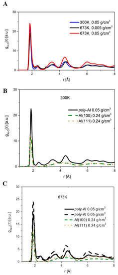 Figure 3 shows partial radial distribution function for the Al–O atom pair, gAl-O(r), simulated for the oxide films formed at 300 K and 673 K. Figure 3A compares the gAl-O(r) computed for oxide films grown on the poly-Al substrate at 300 K and 673 K with oxygen densities of 0.005 g/cm3 and 0.05 g/cm3. It should be noted, in passing, that the gAl-O(r) simulated for oxide film grown at the lowest oxygen density and temperature (0.005 g/cm3 and 300 K) was not included due to the presence of too much “free volume” in the formed oxide film.