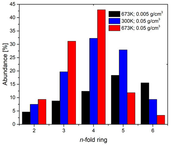 Distribution of n-fold rings in oxide films grown on poly-Al substrates for low (0.005 g/cm3) and high (0.05 g/cm3) oxygen densities at 300 K and 673 K.