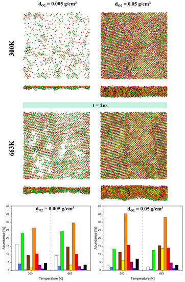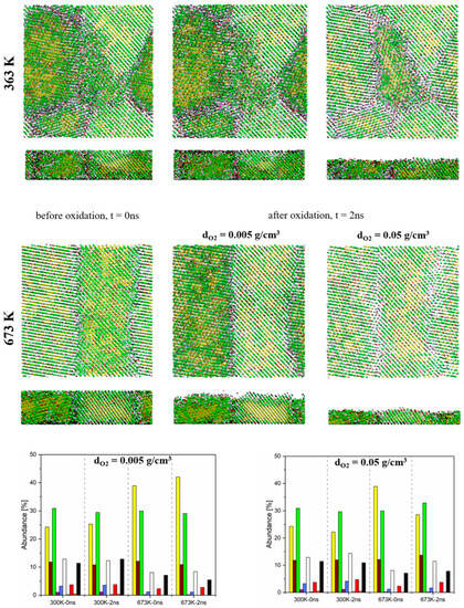 For a deeper insight into the atomic network topology, a Voronoi analysis was performed for the poly-Al substrate and oxide films formed thereon at low and high oxygen densities. The distribution of Voronoi cells (VCs) for Al substrates before and after oxidation at the two oxidation temperatures and two oxygen densities studied is presented in Figure 7. At the top of Figure 7, a side view of the poly-Al substrates before and after oxidation is shown. The colors of the atoms correspond to the VC types belonging to particular groups, including perfect lattice, lattice distortions, and crystal defects. We used the categorization of VC indices provided in our recent paper [31]. According to this, the perfect Al lattice sites (yellow bars in Figure 7) form Group 1 (yellow bars), composed of a single VC index (0.6.0.8.0.). The group of lattice distortions is represented by Group V (green bars in the figure), a family of (0.5.2.x.0.0.) VC indices, and Group VI (brown bars in Figure 7), a family of (0.4.4.x.0.0.) VC indices. The VC types representing liquid-like/amorphous aluminas are those belonging to Group II (purple bars), a family of (0.1.10.x.0.0.) VC types; Group III (violet bars), a family of (0.2.8.x.0.0.) VC indices; Group VIII (white bars), a family of (0.3.6.x.0.0.) VC types; and Group IX (pink bars), a family of (0.0.12.x.0.0.) VC indices. Crystal defects are represented by Group IV (red bars), a family of {(1.3.4.x.x.0.), (1.3.5.x.x.0.), and (1.4.3.x.x.0.)} VC types, and Group VII (orange bars), which is a mixture of (1.0.9.x.x.0.) and (1.1.8.x.1.0.) VC types. Black bars represent VC types with an abundance lower than 0.01%. Grains and grain boundaries (GBs) were observed, whose number decreased with an increasing oxidation temperature. Grains evolved with an increasing temperature by changing shape. The content of the VC type representing a perfect f.c.c. lattice (yellow bars) increased for the Al substrate after oxidation at a constant oxygen density (dO2 = 0.005 g/cm3) as temperature was raised to 673 K. This led to a decrease in the representation of the (0.6.0.8.0.) VC index for the oxide films grown in the high-oxygen-density environment. Oxygen gas density had a less substantial impact on the abundance of the VC type family representing lattice distortions, whose content was almost kept constant. A comparison of the Voronoi cell distribution for poly-Al substrates before and after thermal oxidation at varying temperatures is presented in Figure S5 of the Supporting Information. A non-linear change in the VC type representing a perfect Al lattice was observed with an increasing oxidation temperature. The abundance of the (0.6.0.8.0) VC index increased with an increasing oxidation temperature up to 475 K, which was followed by a sharp decrease at 545 K, and the highest abundance was reached at 673 K. Quite similar behavior was observed for the second most abundant group of VC indices, representing lattice distortions. Based on the observations, increased grain ordering, followed by a decrease at an oxidation temperature between 475 K and 545 K, could be indicative of an amorphous-to-crystalline phase transformation.
