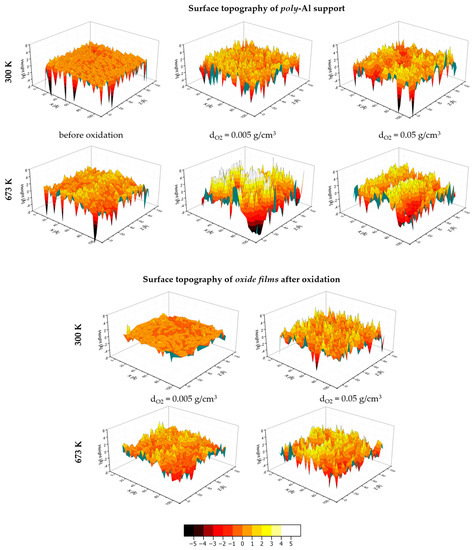 Visible changes in surface topography were observed for the metal/oxide interface after thermal oxidation at the considered oxidation temperatures and oxygen gas densities. The changes were more apparent for the poly-Al surface exposed to a high oxygen density. Changes in surface topography were also observed with an increasing oxidation temperature. Just three regions could be found for the bottom side of the oxide, corresponding to the metal/oxide interface, before oxidation. A similar number of regions could also be found for the oxide film grown at the higher oxygen density and the highest oxidation temperatures. The number and distribution of grain boundaries at the metal/oxide interface at a low oxygen density were different. The surface topography of the metal/oxide interface obtained at a low oxygen density and 300 K did not differ significantly from that of the pristine metal surface before oxidation. More visible changes in surface topography appeared for the oxide film formed at high oxidation temperatures of 545 K and 673 K for a high oxygen density. These might have been indicative of the initial state of long-range atomic order development, leading to amorphous-to-crystalline phase transformation.