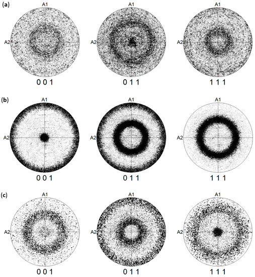 Summary of pole figures in nickel layers obtained by electrodeposition with a current density of 0.01 A cm−2 (a), a current density of 0.1 A cm−2 (b), and after electrodeposition with a current density of 0.1 A cm−2 and annealing 2 h/1000 °C (c). The direction of growth corresponds to the A3 (normal) axis. Clearly developed [110], [100], and [111] fibres can be observed.