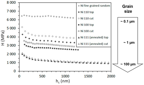 The evolution of hardness with indentation depth is shown for all characterised samples in Figure 7. Except for the fine-grained, all samples present a significant ISE. In the fine-grained sample, the increase in hardness with decreasing indentation depth is not as pronounced. The hardness increases over all depths with decreasing grain size of the samples. Indeed, the differences in macroscopic hardness (H0) as well as hardness profile cannot be attributed to crystallographic orientation, as the lowest values were obtained in the annealed sample with the [111] fibre texture. The [111] crystal direction is known to be the hardest in nickel; however, the triaxial stress field under the indenter makes the effect of crystallographic orientation on hardness negligible (see e.g., [20,21]). In this case, the lower hardness can certainly be attributed to a larger grain size and a lower dislocation density after annealing.